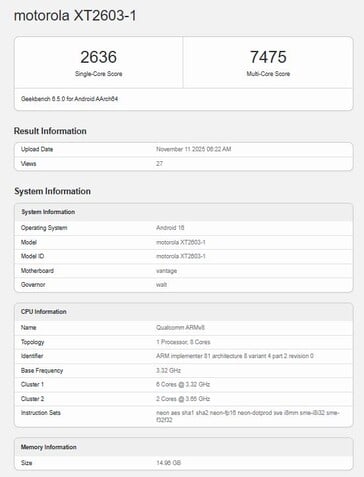 Geekbench 列表显示,这款手机的型号为 "Motorola XT2603-1",内存为 16 GB。性能方面,这款手机的单核分数为 2,636 分,多核分数为 7,475 分。这些数字所代表的计算性能略高于最强大的 骁龙 8 代 3手机的运算性能略胜一筹。