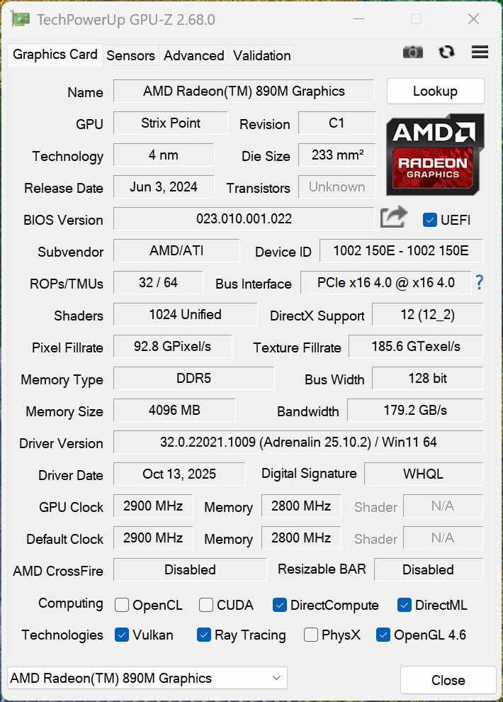 蓝宝石 Edge AI 通过集成 AMD Radeon 890M 提供了强大的 iGPU 性能。该设备在合成基准测试中取得了不俗的成绩,并跻身中场行列。保守的 35 瓦功率限制对 3D 性能有很大影响。iGPU 在实际游戏测试中也证明了其高性能。与目前最快的集成显卡 AMD Radeon 8060S 相比(例如在 Bosgame M5或 GMKtec EVO-X2),Radeon 890M 无法与之匹敌。
