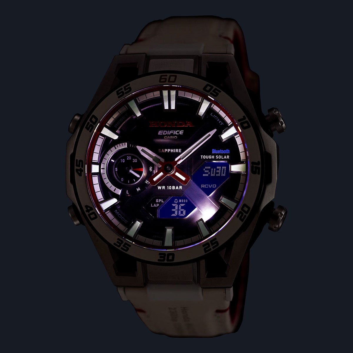 表壳底盖镌刻有官方徽标和红白相间的图案,包装也以胜利的颜色为主题。这款手表采用精钢表壳,尺寸为 50.2 x 45.8 x 11.8 毫米,蓝宝石水晶表镜。它支持蓝牙与智能手机连接,并具备卡西欧标准的 Edifice 功能:太阳能供电、世界时间、秒表、多个每日闹钟、倒计时器、万年历、充电显示、日期显示和 100 米防水。双超级发光二极管(Super Illuminator LED)和玻璃上的防反射涂层确保了夜间的可视性。ECB-2300HR-1A 采用悬臂式表耳,由碳和钢混合制成。
