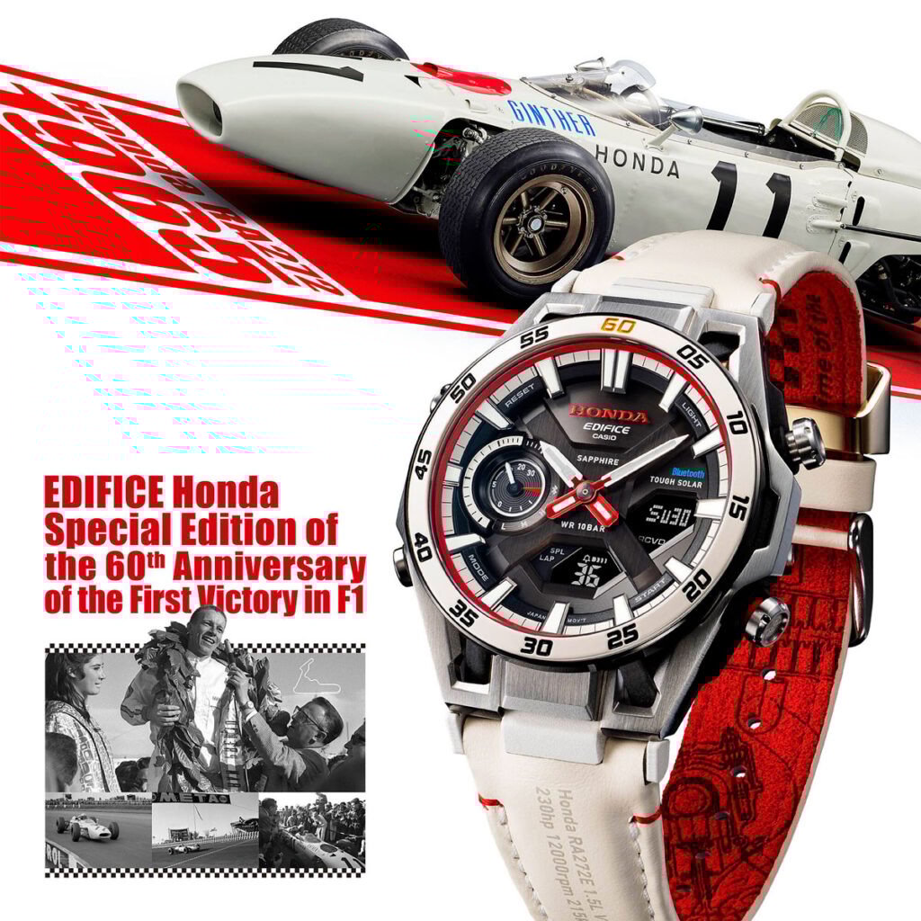 在众多 新款卡西欧手表今年秋季,这家日本钟表制造商又推出了ECB-2300HR-1A这是一款纪念Honda 首次赢得一级方程式大奖赛 60 周年的 Edifice Honda 特别表款。.这是一款限量版表款,其复古(和技术)灵感来自 1965 年本田驾驶 RA272 在墨西哥赢得的 F1 大奖赛,这是日本第一辆在该级别赛事中夺冠的赛车和车队。