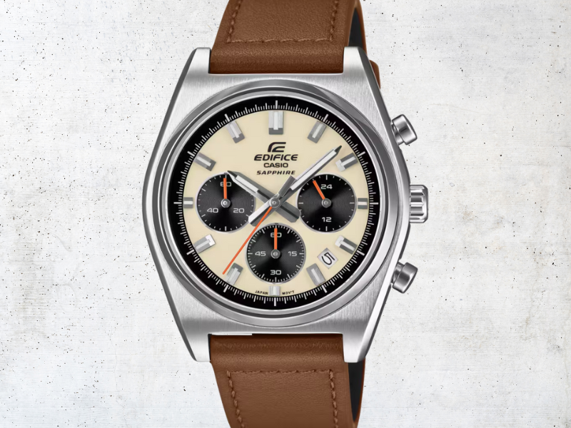 卡西欧的 Edifice EFB-730L-7AV 采用奶油色表面,配备三枚指针、基本日期显示和三个指示表盘。其中两个指示盘与 1 秒秒表工具相连,最后一个指示盘以 24 小时格式显示时间。表面由银色不锈钢外壳包围,尺寸为 47 x 40 x 11 毫米(~1.9 x 1.6 x 0.4 英寸),并配有蓝宝石水晶保护玻璃。