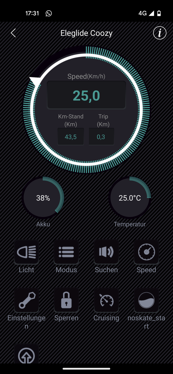 与滑板车上的显示屏相比,该应用程序显示了一些扩大的信息:骑行的总公里数达到小数点后一位,当前行程的距离,确切的电池电量百分比,以及当前温度。 到目前为止还不错,但在我们的测试中,一些显示的数值变得有些令人怀疑。例如,当它在开始时显示50%的电池容量,几分钟后就下降到40%左右。或者温度显示为25度(摄氏度),而外面的实际温度只有19度。由于在骑行几分钟后,温度水平上升到30度以上,我们假设这是一个内部传感器,可能会显示电池温度,例如。