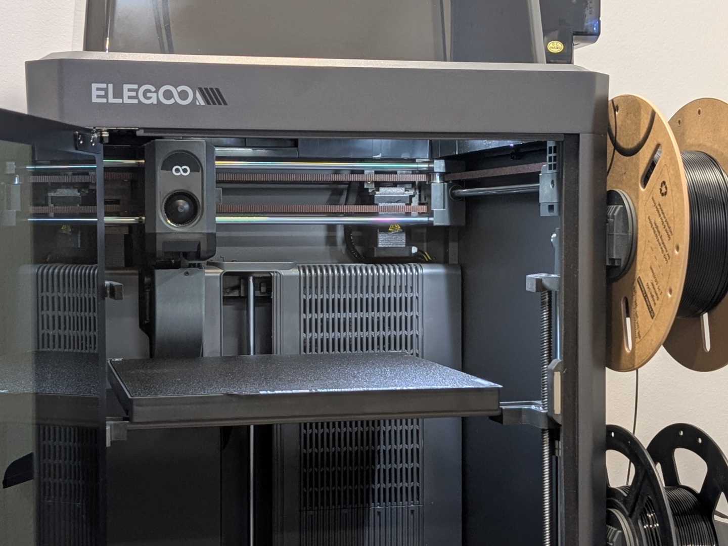 Canvas 系统最多允许使用四种不同的颜色,虽然 Elegoo 并不推荐使用四种不同的长丝类型。这样就可以打印使用 PETG 作为支撑的 PLA 部件,反之亦然,还可以打印兼容长丝的不同组合。Elegoo 还添加了 RFID 传感器,可与自带的 RFID 兼容线轴配合使用。将线轴放在 Canvas 系统旁边,它就能检测出颜色和类型。您只需将其分配到一个插槽即可。