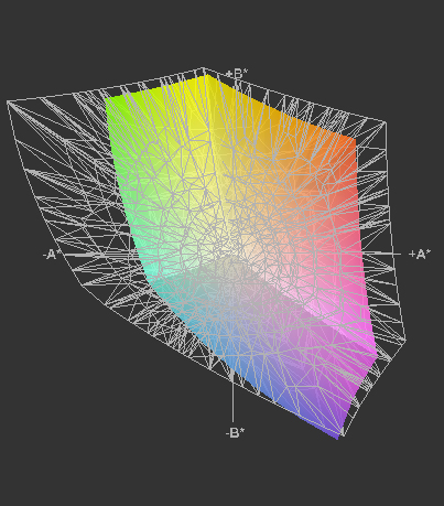 The LG panel is capable of reproducing 97% of the sRGB color space. Since the display gamut actually extends beyond sRGB (green/yellow and purple), the true coverage within sRGB is technically a little bit lower. Not that it matters: overall this panel is about as good as it gets for a White-LED display. Only displays using color LEDs (like the DreamColor display), are able to do even better. Compared to the panels we usually see (which cover about 60% of sRGB), the HP HD+ display is clearly superior.