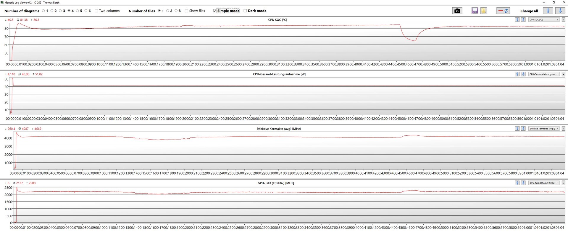 | CPU 时钟 (GHz) | GPU 时钟 (MHz) | SoC 平均温度 (°C) | |