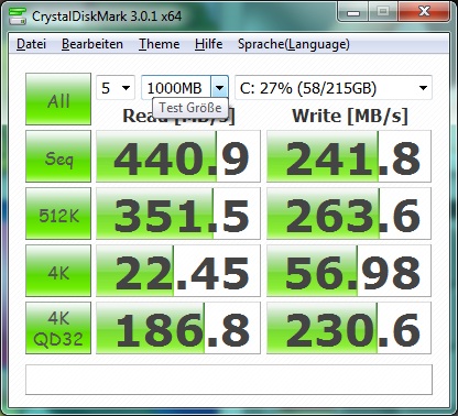 In order to compare performance of the SSD to other SSD models, we use CrystalDiskMark. Intel's SSD 520 Series as well as the OCZ Vertex 3 are a bit faster. The Micron RealSSD is able to outperform Intel's SSD 320 series by a fair margin, however. For a detailed comparison please check here.