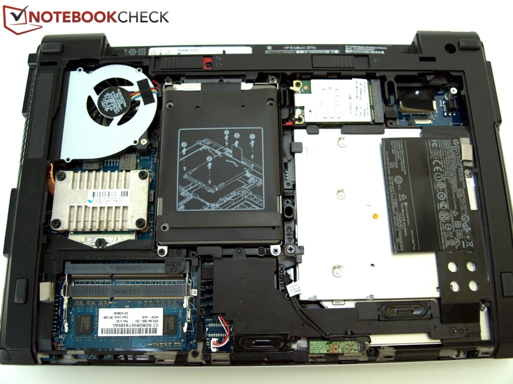 Maintenance of the Elitebook 2570p is extremely easy. After removing the entire bottom plate via sliding latch mechanism (no screws need to be removed), all components are readily accessible.