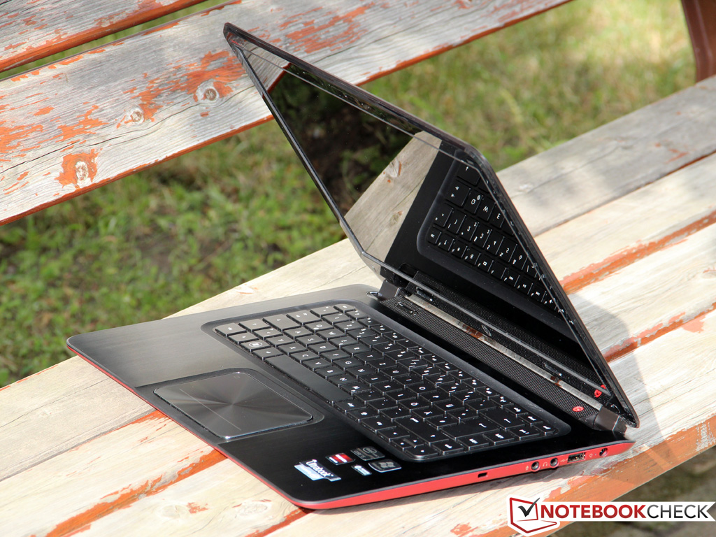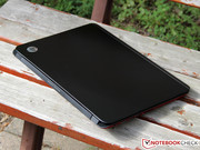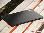 SApart from the slim profile characteristic of Ultrabooks, the Envy 6 immediately impressed us with its beautiful design and excellent materials. While the back of the display and the top of the chassis are finished in black matte aluminum, the red underside offers a stark contrast - just in case you often find yourself looking at the laptop from below. Attention to detail is reflected in the chrome-look framing of the touchpad, adding to the impression of high build quality that even puts some of the pricier Ultrabook competitors to shame. Unfortunately, the case attracts dirt and finger prints all too easily - frequent use of a cleaning cloth is compulsory.