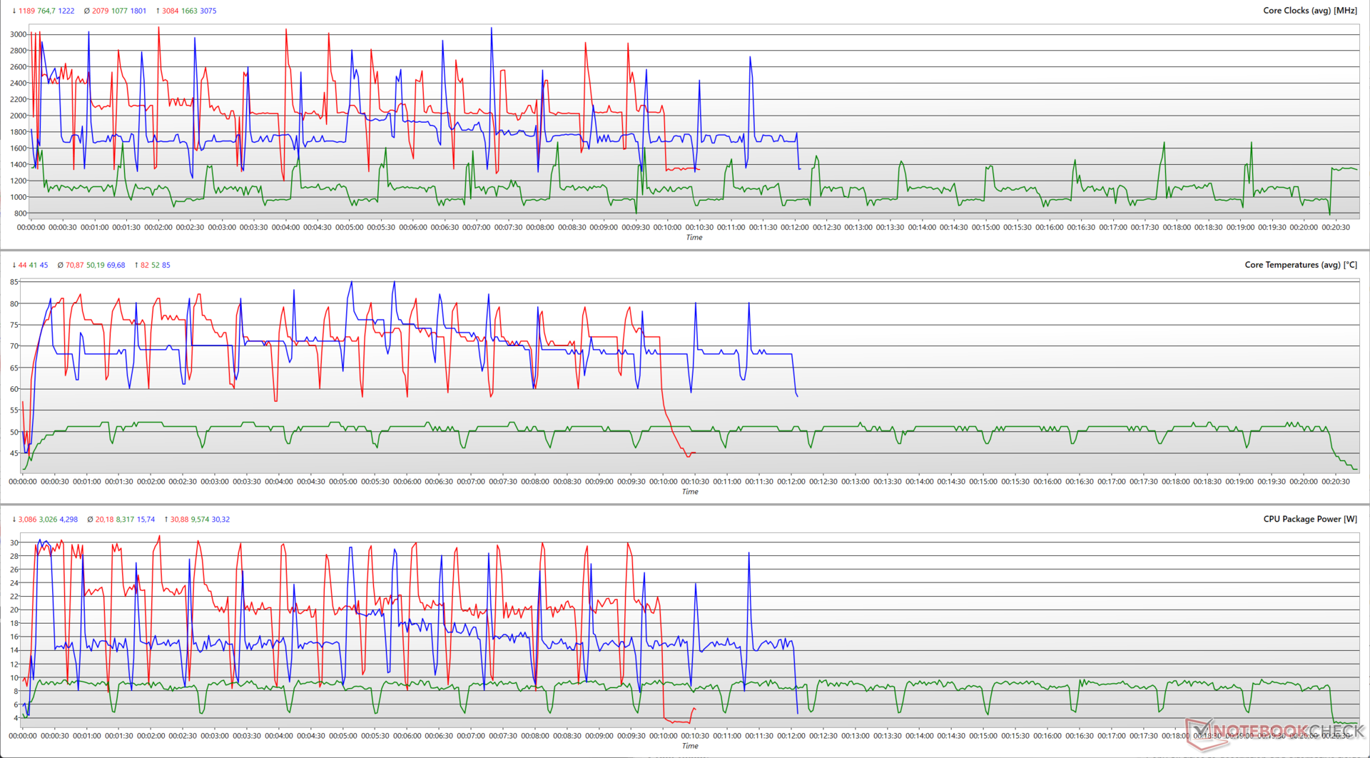 | 压力测试 | CPU 时钟 (GHz) | GPU 时钟 (MHz) | CPU 平均温度 (°C) | GPU 平均温度(°C) |