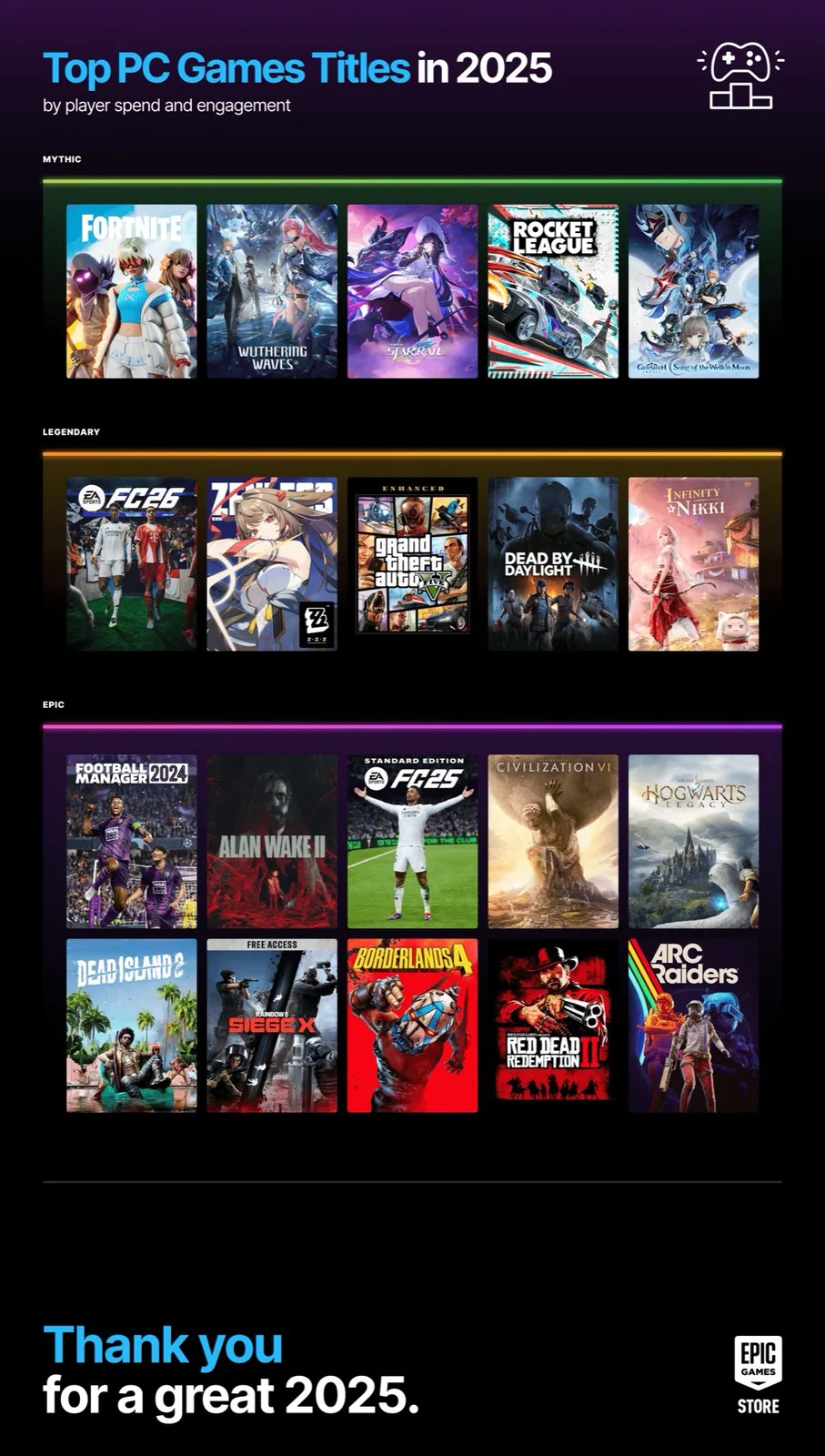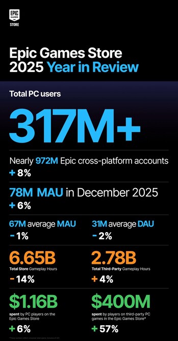 2025 年,Epic 游戏商店成功打破了自己的多项记录,去年,Steam 的替代品 Epic 游戏商店的月活跃用户达到了 7800 万,他们在第三方游戏上的总花费超过了 4 亿美元,这还不包括《堡垒之夜》。总体而言,用户在第三方游戏上花费了 27.8 亿小时,其中很多可能是每周免费游戏带来的。