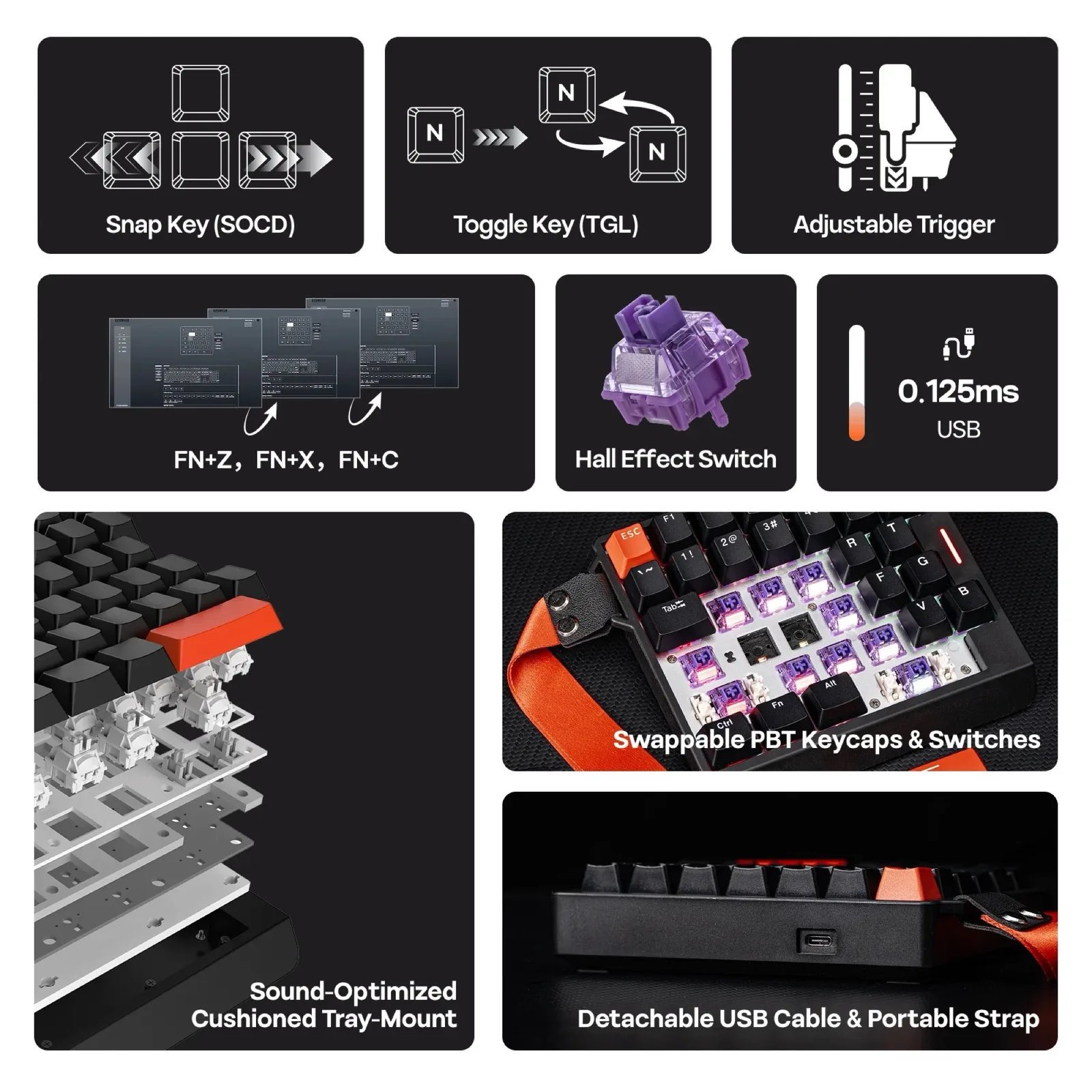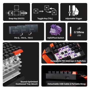 键盘采用带铝板的塑料外壳,可提高稳定性。霍尔效应开关的设计可实现特别快速的按键响应,触发点也可调节。标配 RGB 背光和 PBT 键帽。这款重 350 克的键盘配有腕带,便于携带。官方支持 Windows 和 Linux,但不支持 macOS。
