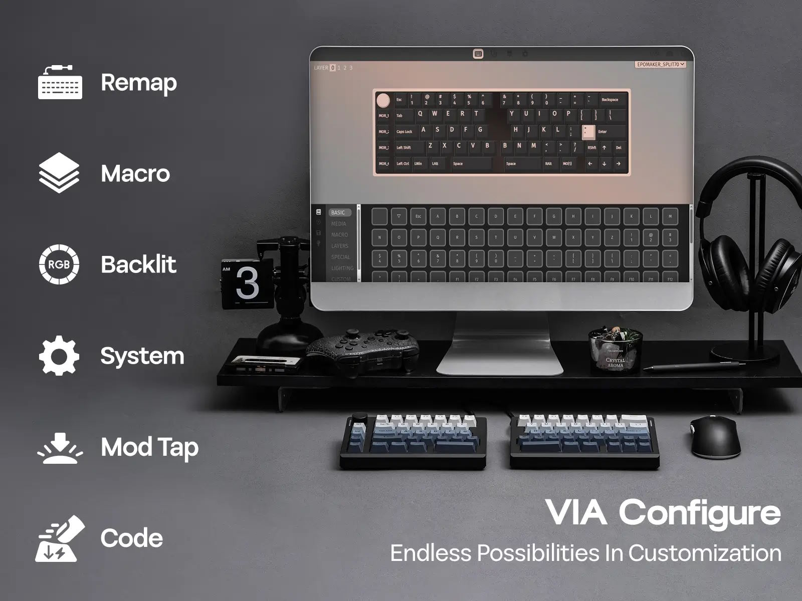Split70就其基础技术而言,这是一款相当标准的键盘,尤其是在按键方面。不过,它的基本设计非常出色,因为 Split70 并不是一个整体。相反,它由两个独立的部分组成。该设备完全采用无线技术,通过 2.4 GHz 连接传输数据,轮询率高达 1,000 Hz。蓝牙的轮询率为 125 Hz。使用蓝牙时,延迟时间从有线连接的 3 毫秒和 2.4 GHz 模式的 5 毫秒增加到 15 毫秒。