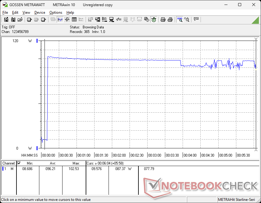 我们使用小巧(约 12.5 x 5 x 3 厘米)的 90 瓦桶装交流适配器记录的最大功耗为 103 瓦。我们希望该机型在未来的迭代中能完全采用 USB-C 充电技术。
