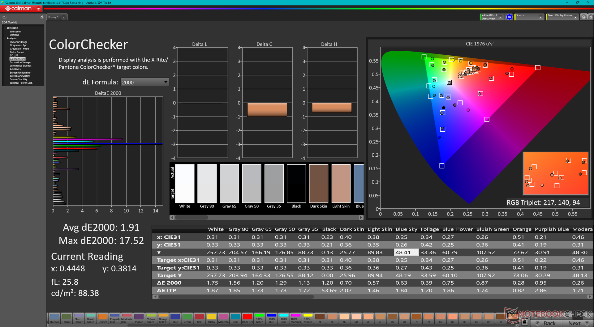 | Colorchecker dE 2000 calibrated * | 1.91 | 1.82 5% | 0.74 61% | 3.52 -84% | 1.8 6% | 1.34 30% |