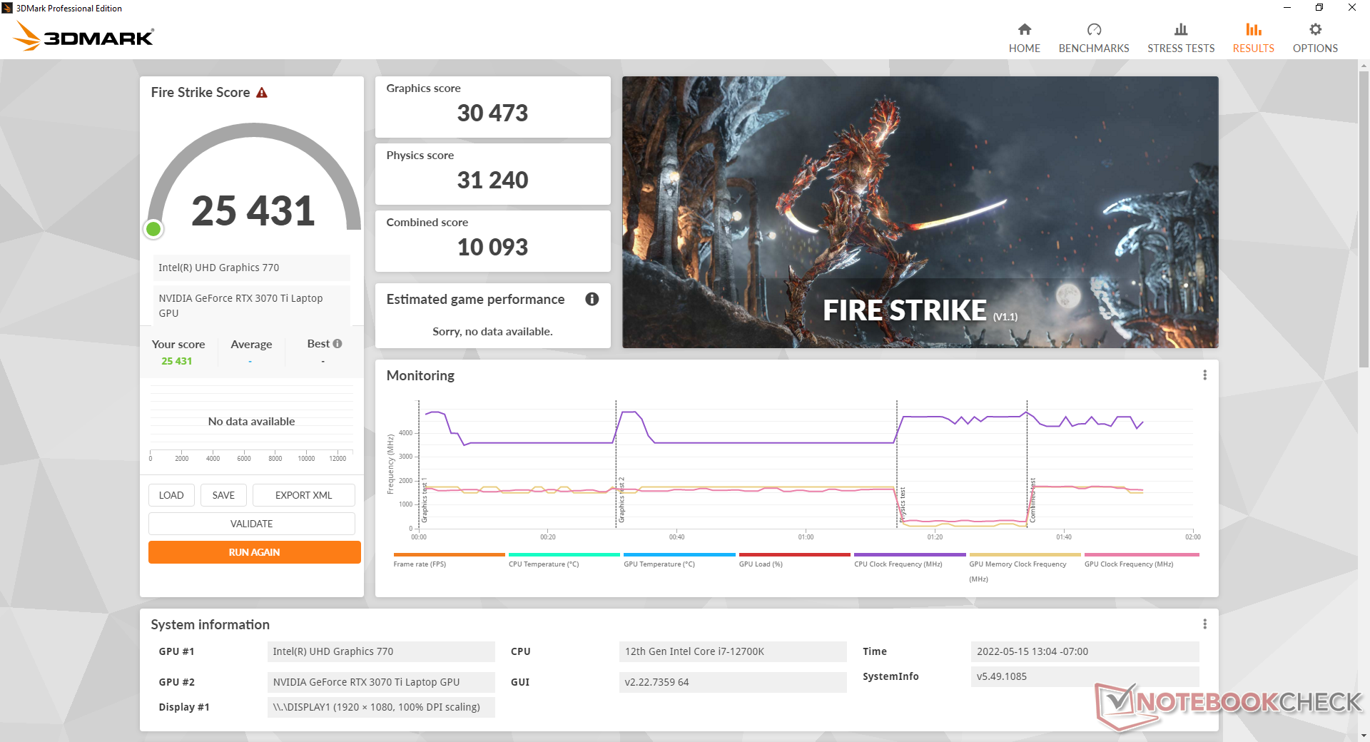 | 86.1 % v7 (old) | 06 / 2022 | Eurocom Raptor X15 i7-12700K, GeForce RTX 3070 Ti Laptop GPU | 2.7 kg | 32.5 mm | 15.60" | 1920x1080 | |