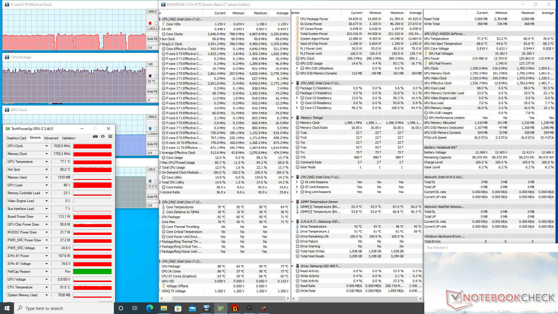 在桌面上空转时,耗电量相当低。我们的设备在台式机上空转时的功耗在12瓦到22瓦之间,而使用英特尔第九代台式机CPU的更老的Eurocom Sky X4C的功耗是33瓦到44瓦。尽管如此,在运行要求更高的应用程序时,消耗量仍然很高。运行 Witcher 3比如说,运行 "Dreamer",需要的功率比任何配备英特尔或AMD H系列CPU和类似GeForce RTX 3070级GPU的笔记本电脑都要大。