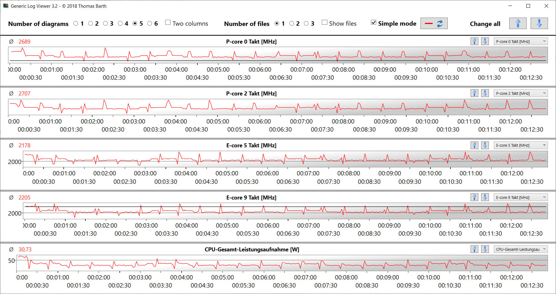 Cinebench R15基准的多线程测试分别以3.8 GHz(P核)和3 GHz(E核)处理。单线程测试以2.2至4.7GHz(P核)和1.5至3.4GHz(E核)运行。在电池模式下,时钟速率较低。CB15的循环测试显示。多线程负载只有在短时间内满足高Turbo时钟的要求。几秒钟后,速率最多下降到一个中等水平。