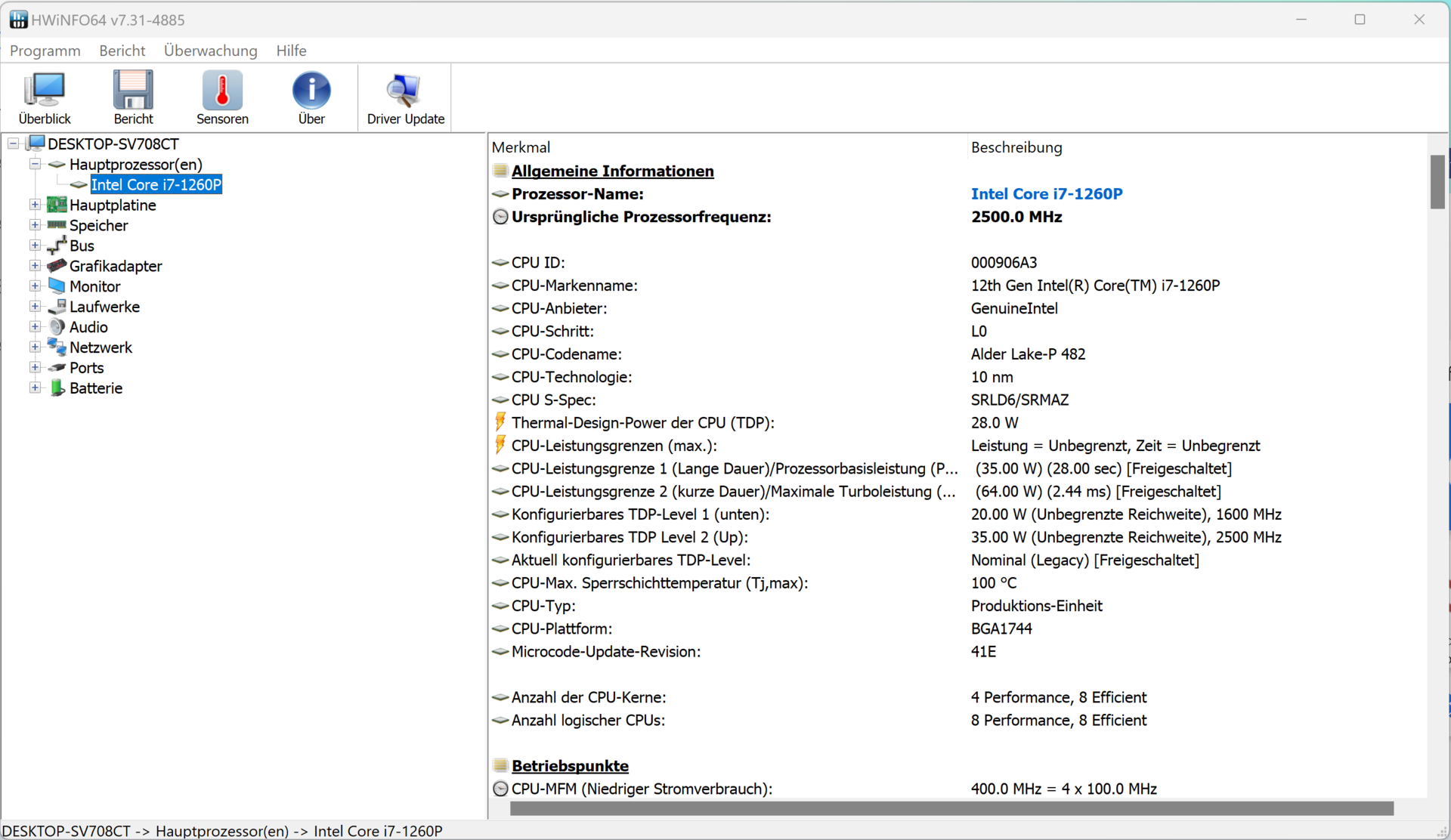 芯片 酷睿i7-1260P-处理器(Alder Lake)包括四个性能核心(超线程,2.1至4.7 GHz)和八个效率核心(无超线程,1.5至3.4 GHz)。总的来说,这导致了16个逻辑上的CPU核心。该CPU提供了高于平均水平的基准测试结果。