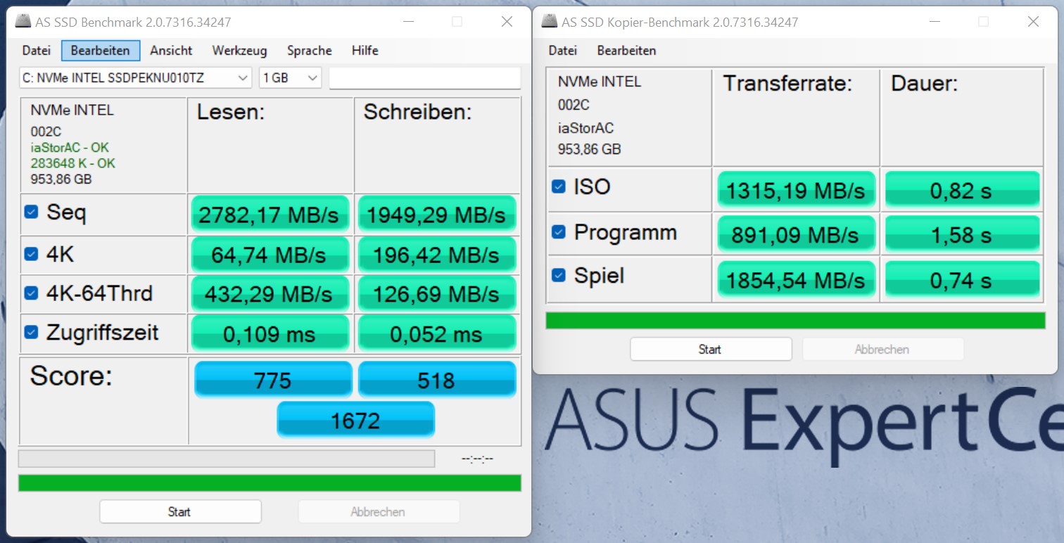 主观的性能印象也受到所使用的SSD的显著影响。来自英特尔的1TB M.2-2280固态硬盘提供了快速的读取和写入率。我们特别想指出的是非常好的4K读取率,这将大大增加许多小文件的加载速度。