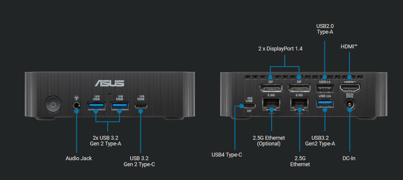 连接选项包括 Wi-Fi 7(或 Wi-Fi 6E)、蓝牙 5.4 和两个 2.5 Gb/s 以太网端口。华硕在 ExpertCenter PN54-S1 上提供了广泛的输入/输出接口,包括 USB 4.0、USB 3.2 Gen Type-A、USB 3.2 Gen 2 Type-C、USB 2.0、HDMI 2.1 和 DisplayPort 1.4。