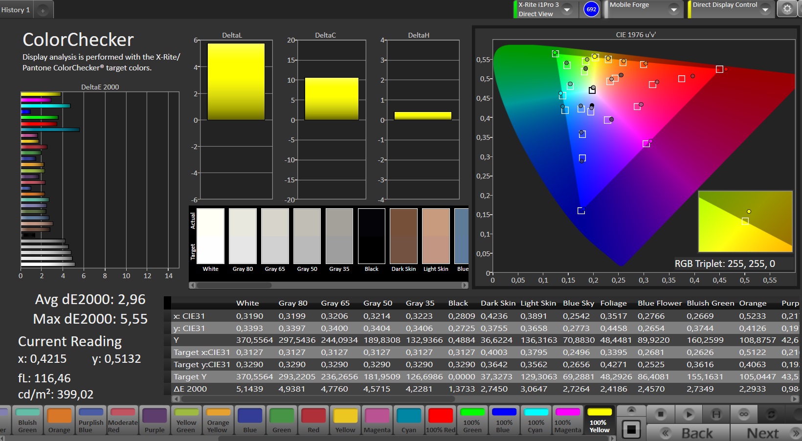 | Colorchecker dE 2000 max. * | 5.55 | 14.2 -156% | 13.32 -140% | 8.9 -60% |