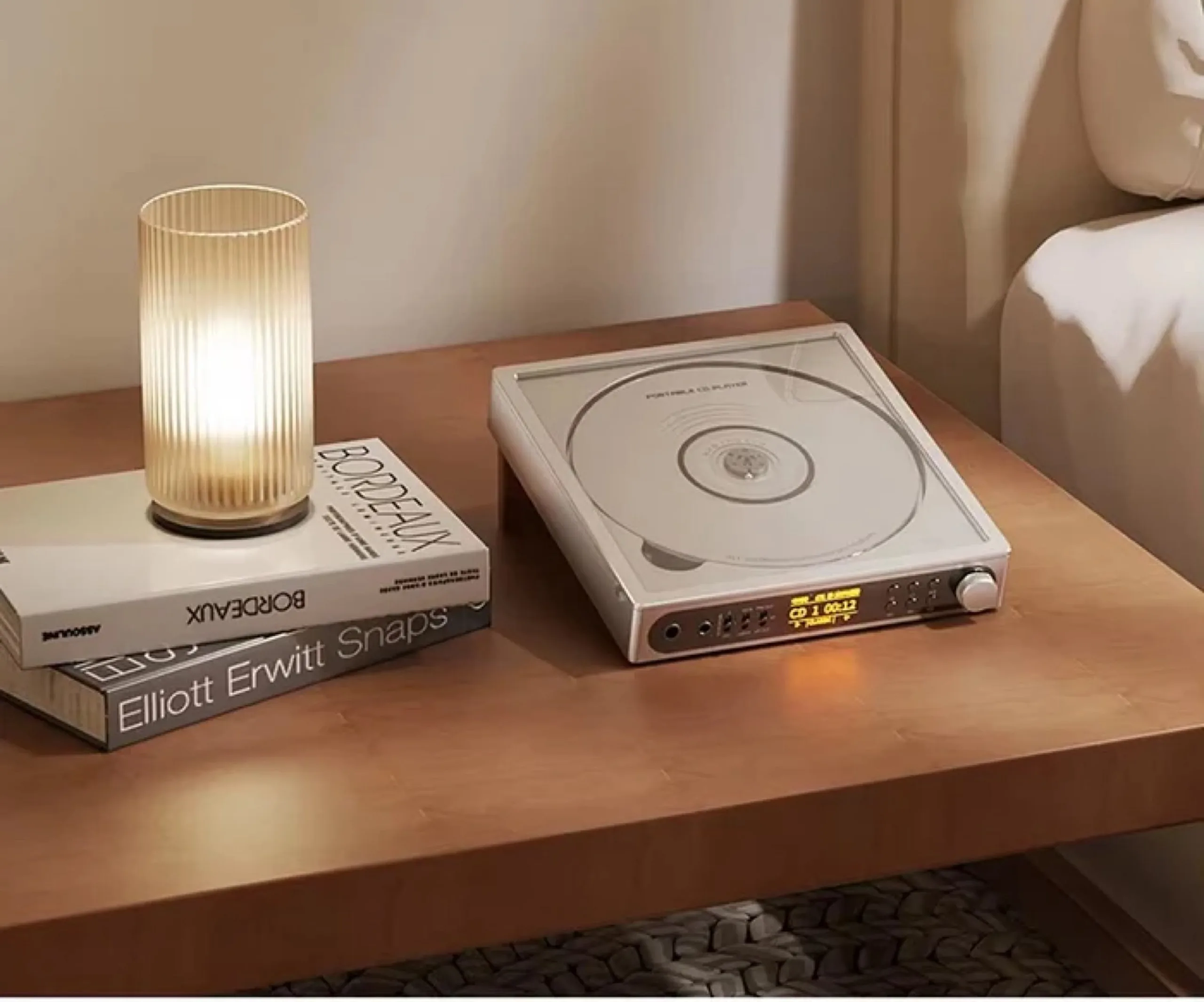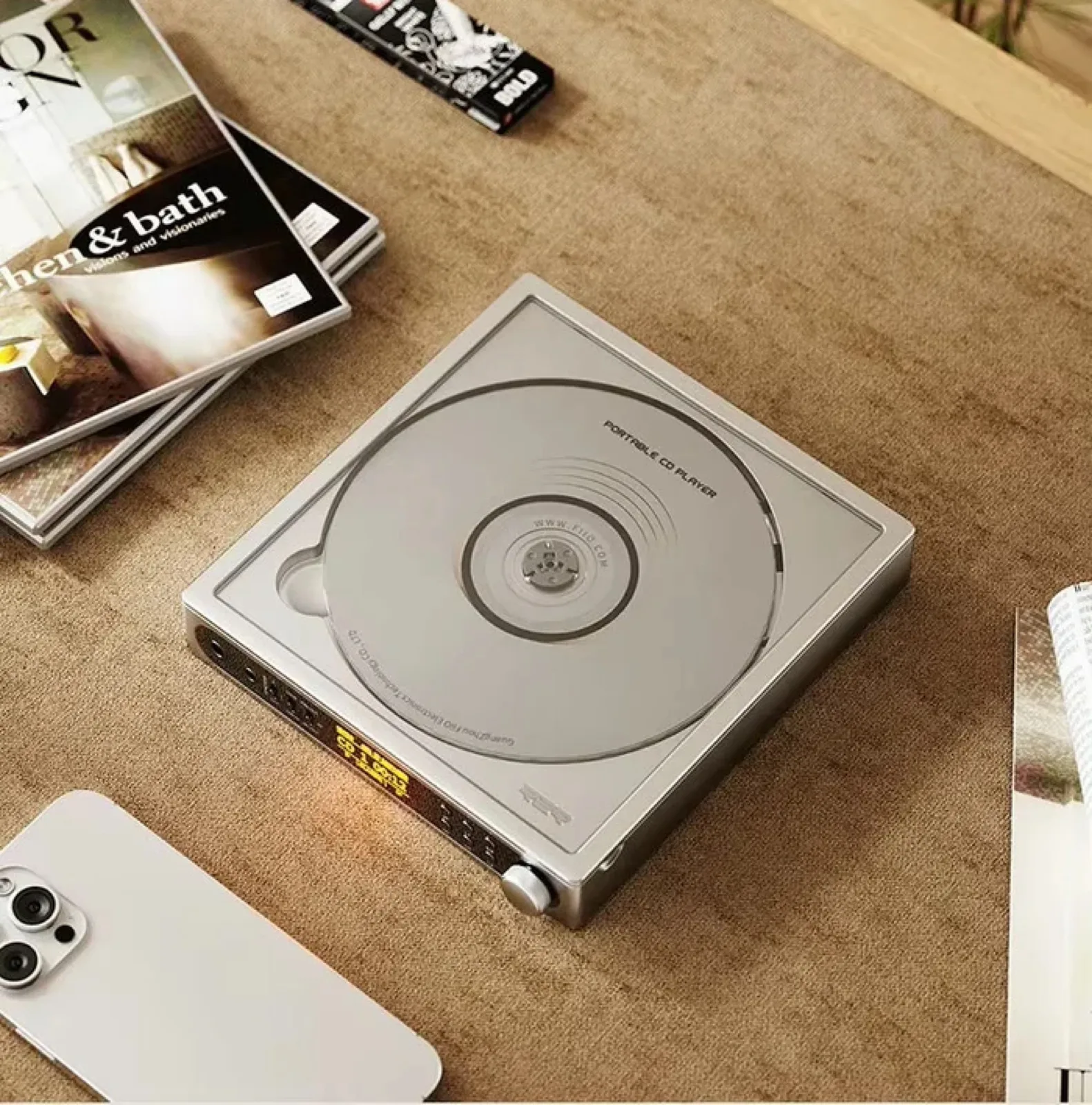 全新的 FiiO DM15 R2R CD 播放器采用时尚复古的设计,顶部透明,可以看到正在播放的 CD。前面板上有一个音量控制旋钮、几个用于控制均衡器的按钮和一个用于显示播放时间的 0.96 英寸显示屏等。