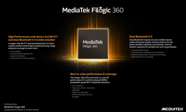 Filogic 360 也是今年早些时候发布的 Filogic 380 的缩小版。它没有 860 的功能,因为它是为智能手机/平板电脑/笔记本电脑而不是路由器量身定制的。它具有 Wi-Fi 7 的所有基本功能,如 4096 QAM、MU-MIMO(多用户、多输入、多输出)和高达 2.9 Gbps 的下载速度。双蓝牙 5.4 也是联发科 Filogic 360 的另一项重要功能。它为历来缺乏 LE 音频支持功能的笔记本电脑带来了福音。
