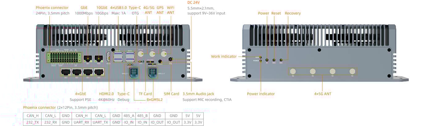 这款迷你 PC 的尺寸为 277.95 x 136.09 x 88.0 毫米,配备 64 GB LPDDR5 内存和容量为 64 GB 的 eMMC 存储器。还可安装 M.2 2280 格式的 M.2 SSD。视频输出可通过 HDMI 2.0 或特殊的 GMSL2 连接实现。网络连接可通过 10 Gbps 和 5 Gbps 以太网端口实现。其他端口包括 USB 3.0、USB 3.2、凤凰接口、RS485、RS232、CAN 2.0 和 UART。