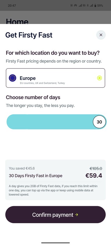 由于我们向该团队报告了一些错误(顺便说一下,他们的支持速度很快,而且非常乐于助人),我们还获得了一天试用该初创公司第二款产品的机会:Firsty Fast。在这里,所有速度障碍都不复存在,我们的下载速度达到了约 224 Mbps,上传速度略低于 30 Mbps。不过,我们觉得在欧洲,这种每天只需 3.5 欧元(3.8 美元)就能获得 2 GB 快速数据套餐的升级方案相对昂贵。如果购买 30 天的 Firsty Fast 套餐,目前在欧洲的价格约为 60 欧元(66 美元),即每千兆字节不到 1 欧元。虽然这个价格本身并不算高,但只有当你每天真的需要这么多数据时才值得购买。在其他地区,Firstly Fast 的价格可能会有所不同,一般从每天 2 欧元或 2.1 美元左右开始。