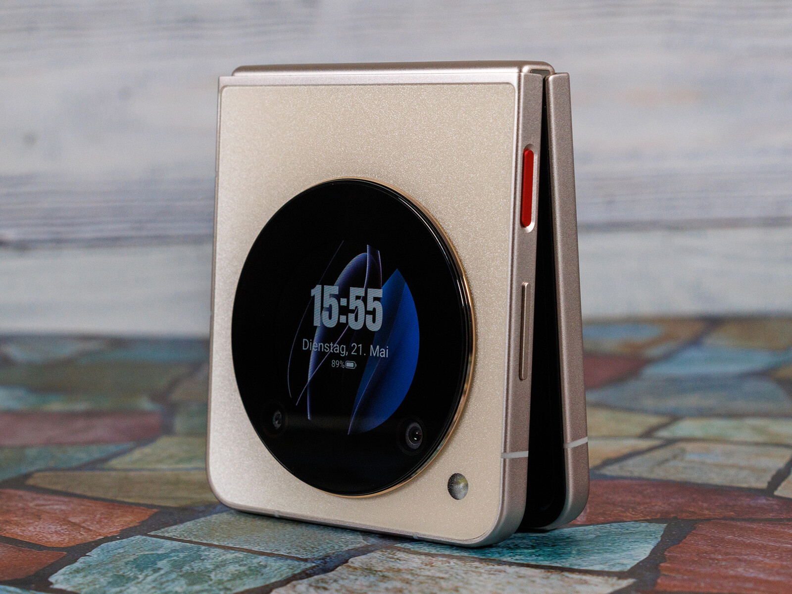 我们喜欢努比亚 Flip 的制造质量。所有缝隙都紧密均匀,显示屏表面比率为 86%,相当不错,但远低于制造商的规格(95.4%)。铰链据说可以承受 200,000 次以上的折叠,并允许多种打开角度。虽然显示屏折叠很容易看到和感觉到,但并不影响日常使用。不过,作为一款可折叠智能手机,Flip 的机身相当厚重。