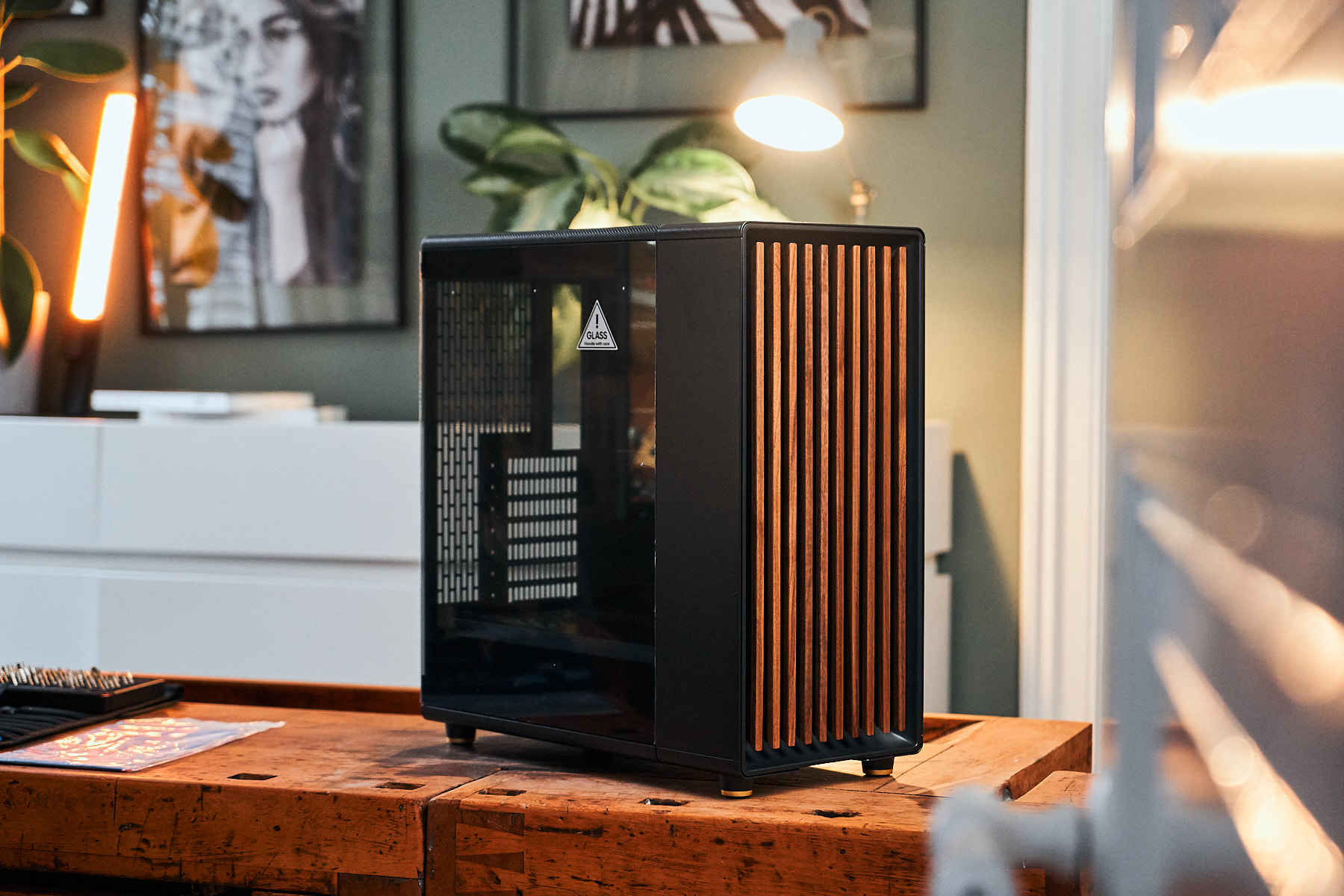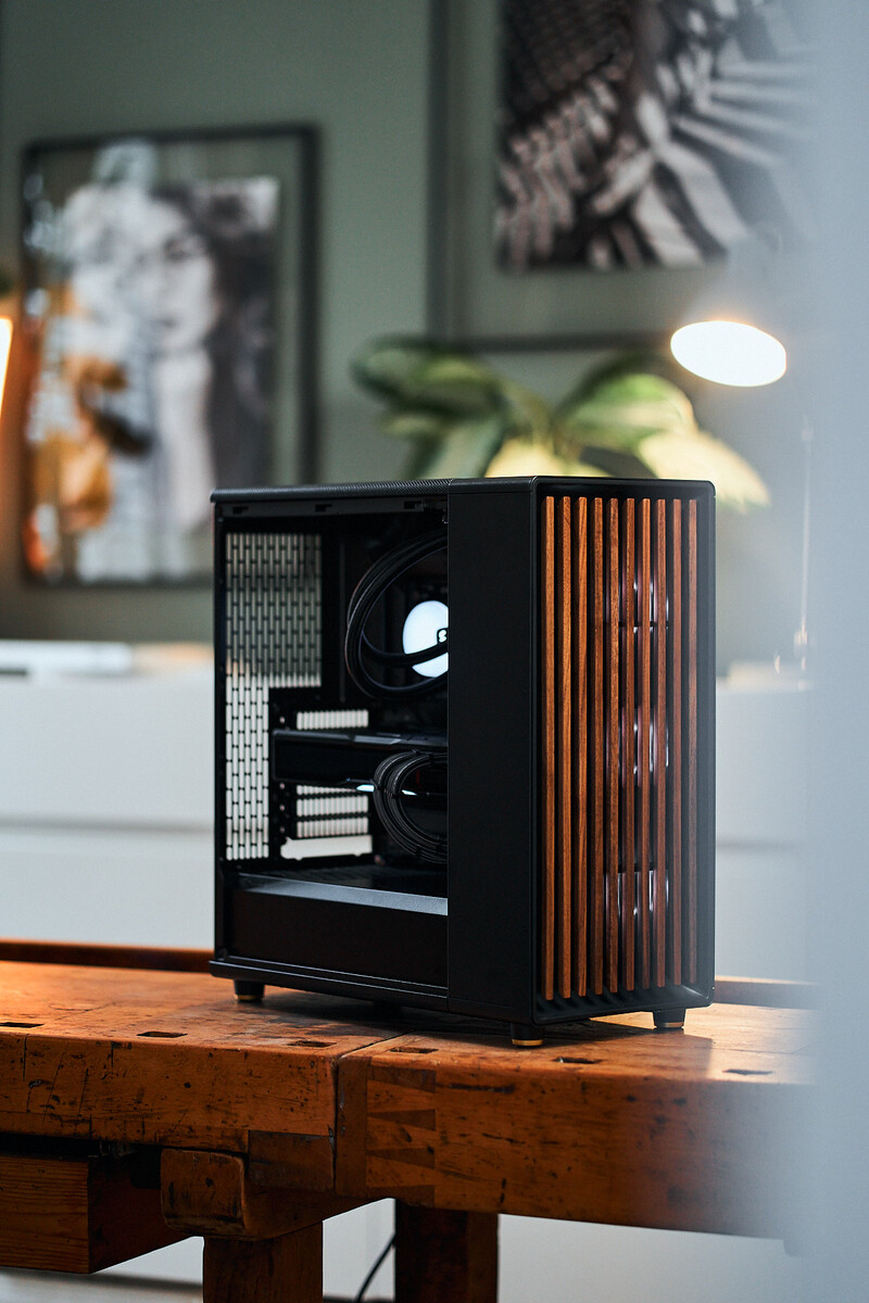 北方以高质量的材料选择和个性化的细节不露声色地展示自己。玻璃、钢网板和实心侧板的材料组合给人以高质量的印象,而电源按钮和音频端口的金色点缀与正面的温暖木质色调完美契合。用于拆卸顶板的皮圈和金色脚垫显示了来自Fractal的瑞典人对细节的关注,他们把新的North放在一起。