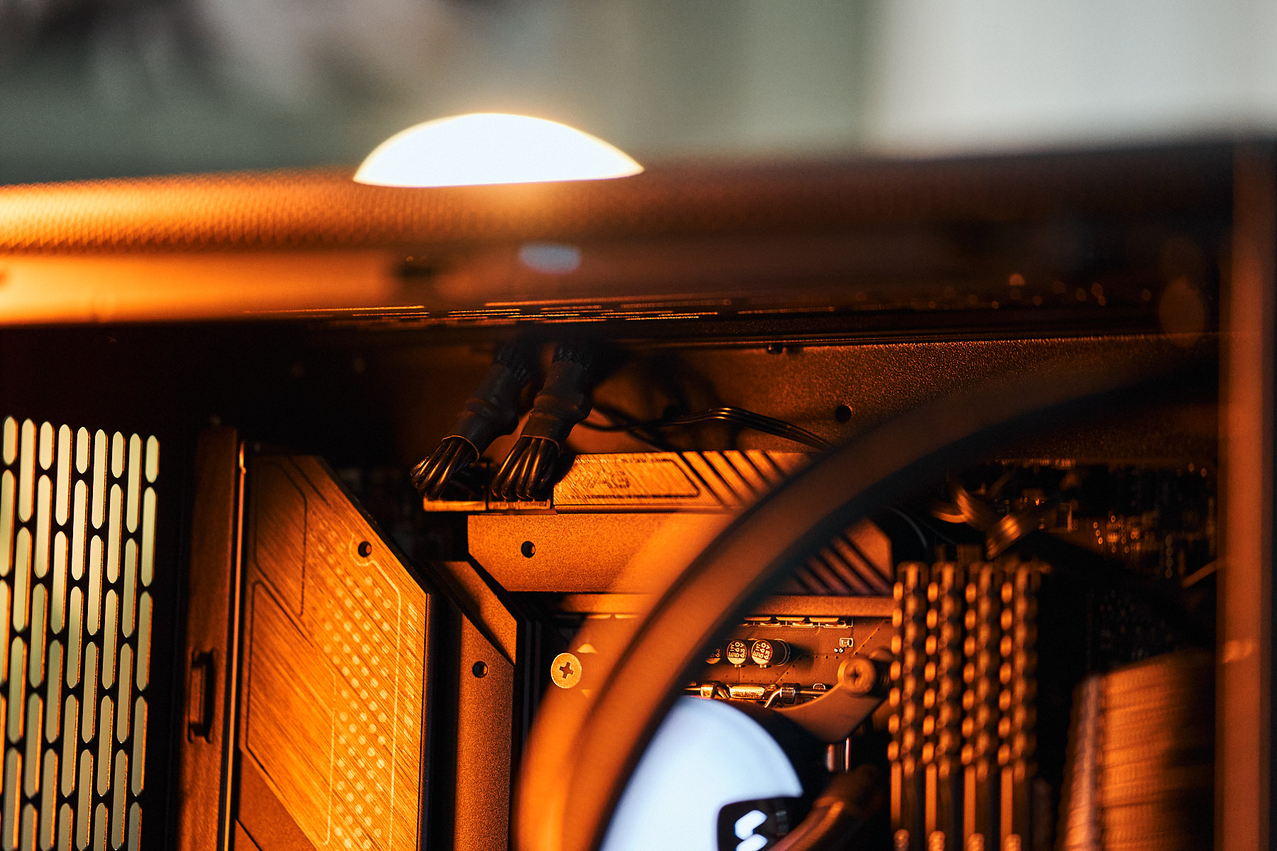 像往常一样,电源可以放在一个盖子下面,但在我们的个案中,机箱的紧凑尺寸在这里变得很明显。我们来自BeQuiet!的模块化750W电源,除了附带的电缆外,还配备了织物覆盖的延长线。由于我们还在机箱的地下室存放了一个传统的10TB,所以多余的电缆变得相当紧张。当侧板关闭的时候,你不应该太在意你看不到由此产生的混乱,因为Fractal在散热器后面留下了一个相当大的缝隙,这无情地暴露了可能的电缆管理遗漏。