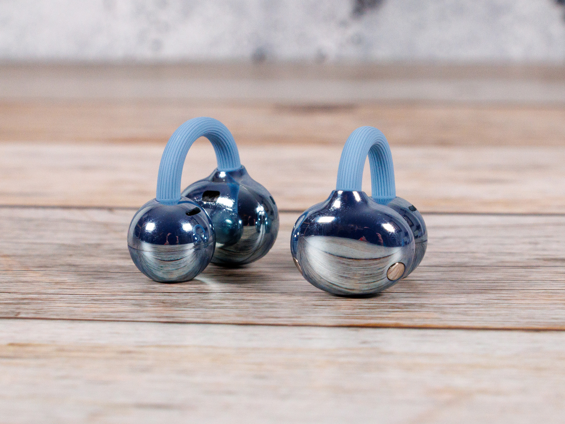 C 桥连接着另外两个元件:舒适豆和声波球。前者装有电池和触摸感应控制面板,后者装有扬声器和麦克风。耳机会自动检测佩戴者的耳朵。