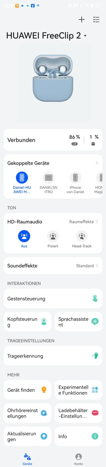 通过蓝牙配对,设置华为 FreeClip 2 非常简单。由于采用了 Microsoft Swift Pair 技术,只要首次打开充电盒,电脑就会自动进行配对。这同样适用于华为智能手机和平板电脑。由于不支持谷歌快速配对,配对过程必须手动启动。多点支持允许同时配对两台设备,配对列表最多可管理八台设备。
