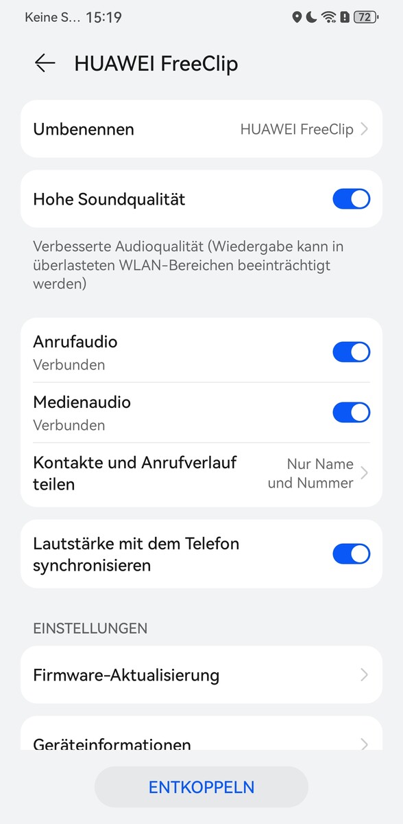 华为 FreeClip 的设置与制造商生产的其他耳机如 FreeBuds Pro 3.如果您的华为智能手机至少装有 EMUI 10 或 HarmonyOS 2,那么第一次打开充电盒时就会建议连接耳机。不过,谷歌的快速配对不支持,而微软的 Swift Pair 则支持。此外,还可以进行传统的手动配对。华为耳机具有双连接功能,可同时与两台设备配对;配对列表最多可管理八台设备。