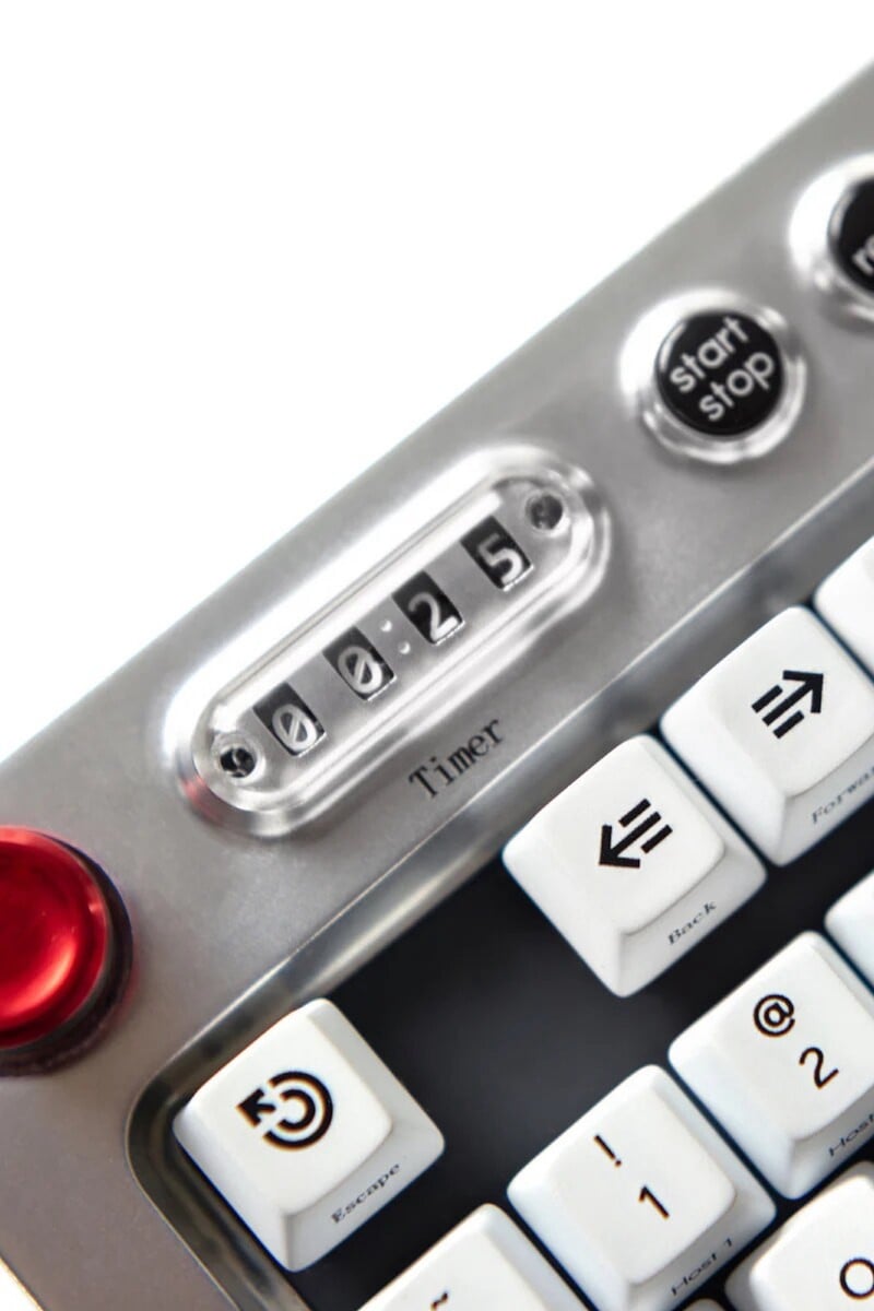 乍一看,Freewrite Wordrunner 就像一个没有数字键盘的全尺寸机械键盘。它的突出特点是输入设备顶部的两个显示屏。其中一个显示短时间写作冲刺的计时器。每次重置后都可以手动设置持续时间。
