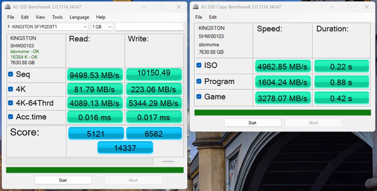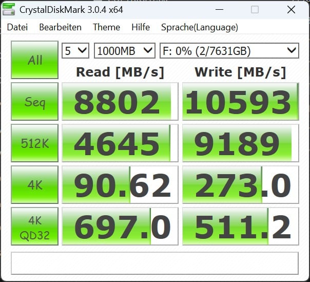 在我们的测试系统中,配备 8 TB 的金士顿 Fury Renegade G5 几乎可以充分发挥其巨大的性能潜力。在 CrystalDiskMark 6 基准测试中,我们测得的连续读取速率超过 14,900 MB/s,写入速率约为 14,200 MB/s。不出所料,AS-SSD 基准测试的结果要低一些。在与其他内部高端固态硬盘的直接比较中,Fury Renegade G5 明显领先于三星 9100 Pro 或金士顿 KC3000 等竞争对手的型号。