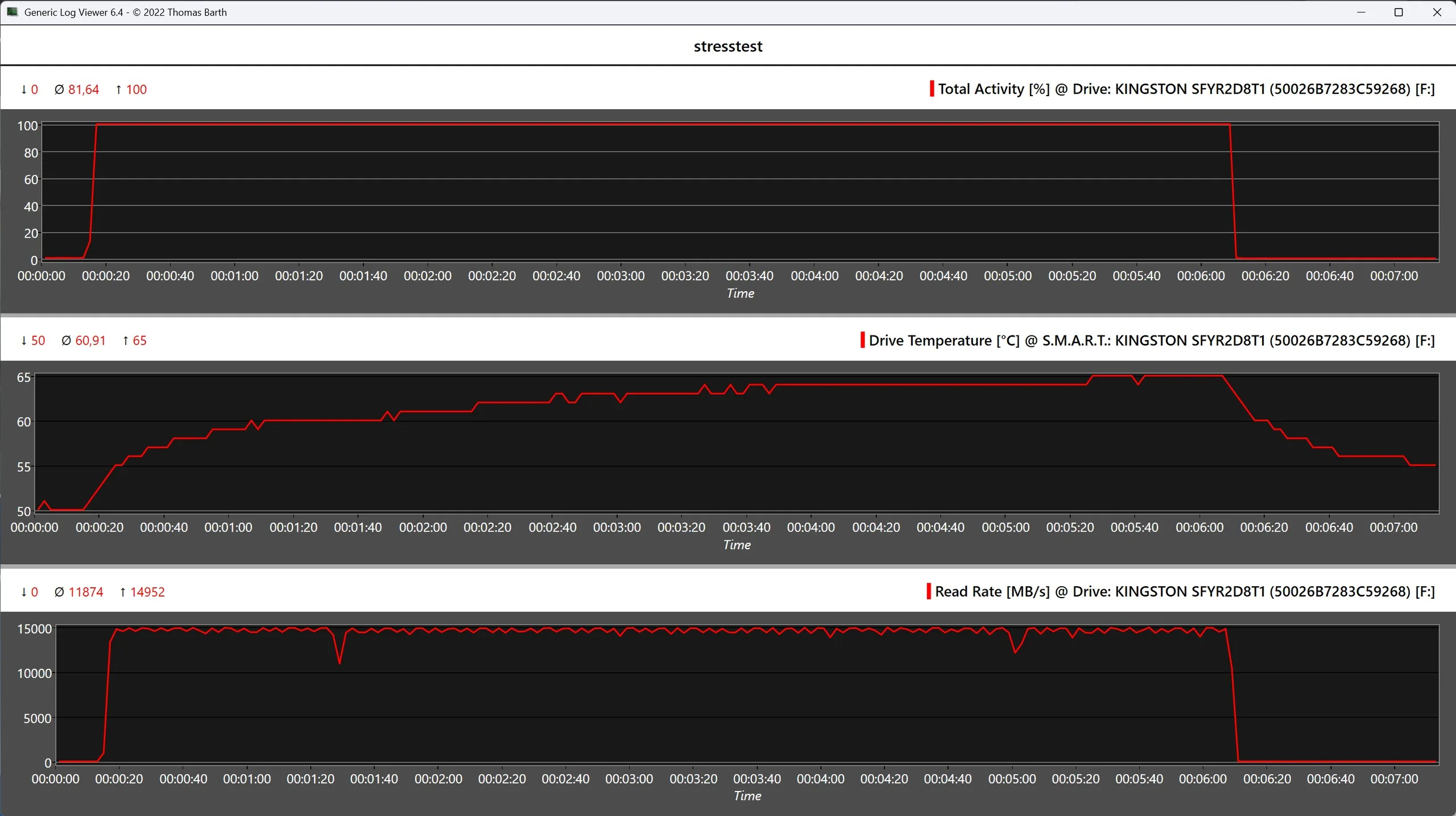 在 Diskspd 耐用性测试中,该固态硬盘的性能也基本保持稳定。虽然性能偶尔会有轻微波动,但在整个测试期间并没有明显下降。金士顿 Fury Renegade G5 的平均速度超过 14000MB/s,在持续负载下也表现出色。虽然金士顿 Fury Renegade G5 的两个版本都能提供令人印象深刻的性能,但 8 TB 型号在持续负载下的读取率略高于 4 TB 版本。不过,这需要足够的散热:结合所使用的华擎主板的散热器,这在测试中发挥了出色的作用。不过,在笔记本电脑或迷你 PC 等紧凑型系统中,较高的温度可能会导致连续负载下的性能损失显著增加。