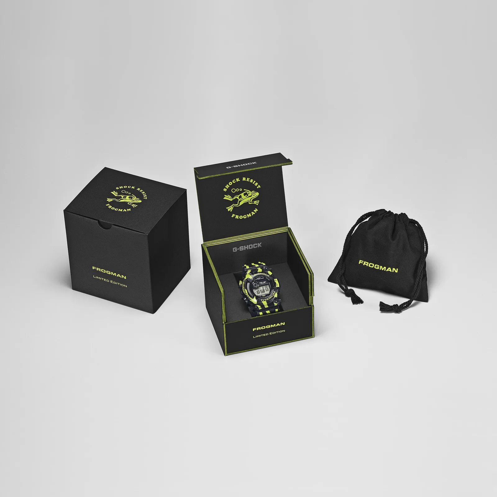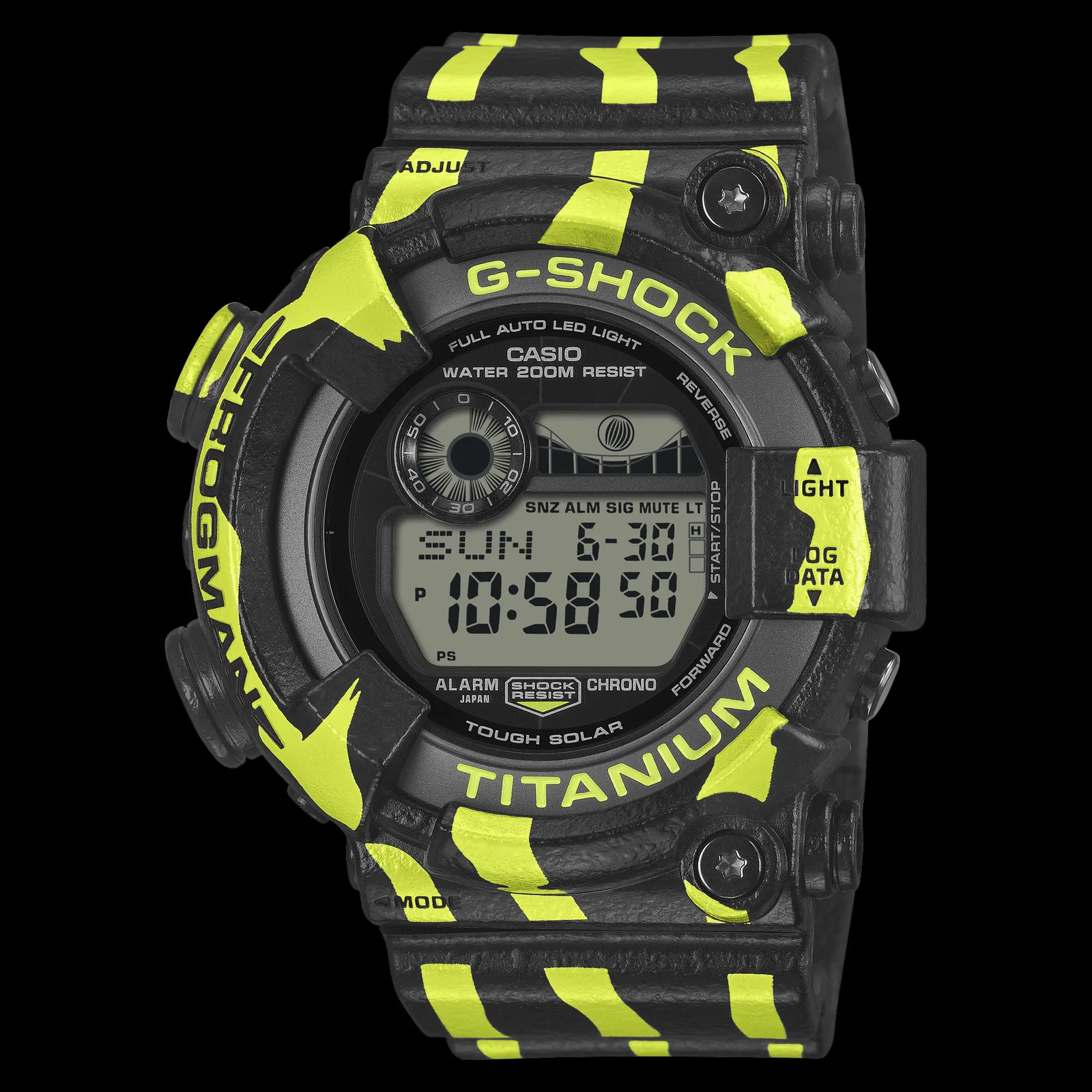 经过数月的 经过几个月的零星泄露和传言卡西欧已在日本开始预售新款蛙人,上市型号为GW-8200TPF-1JR.它属于 Master of G Sea 系列,计划于 2025 年 12 月发布。该版本以南美热带雨林中的毒镖蛙为原型,采用了黑色和荧光绿相间的图案,显得十分耀眼。图案和表面处理均以青蛙的颜色和凹凸纹理为主题。