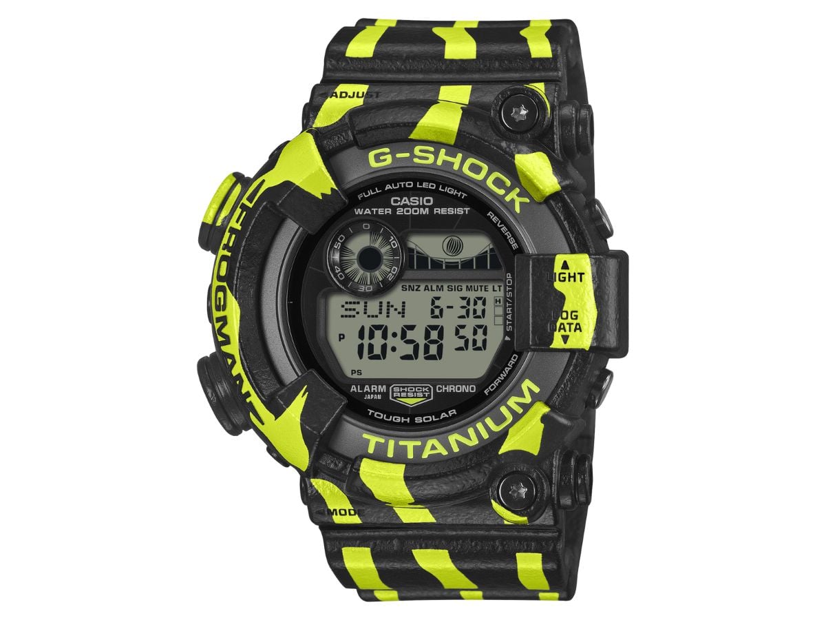 卡西欧 G-Shock GW-8200TPF-1 采用醒目的荧光绿和黑色设计,三条条纹模仿毒镖蛙的条纹。手表的树脂外圈和表带具有类似青蛙皮肤的质感,金属表背镌刻有品牌的潜水青蛙标志。该表款采用钛金属内圈,尺寸为 52.0 x 50.2 x 18.0 毫米(约 2.05 x 1.98 x 0.71 英寸),重 84 克(约 3.0 盎司)。