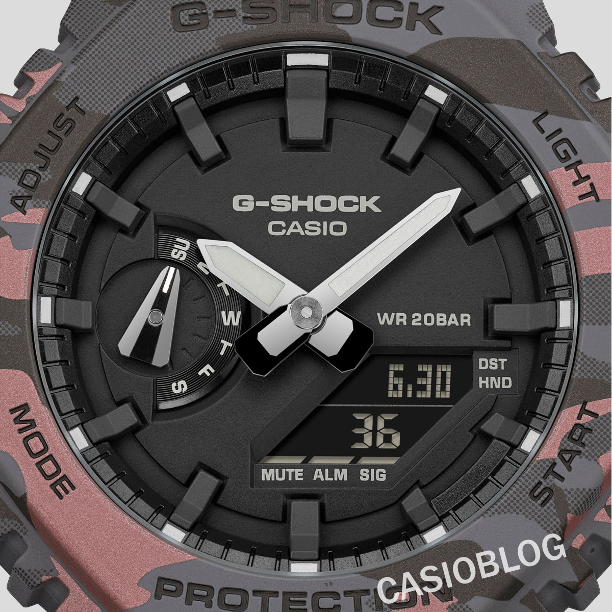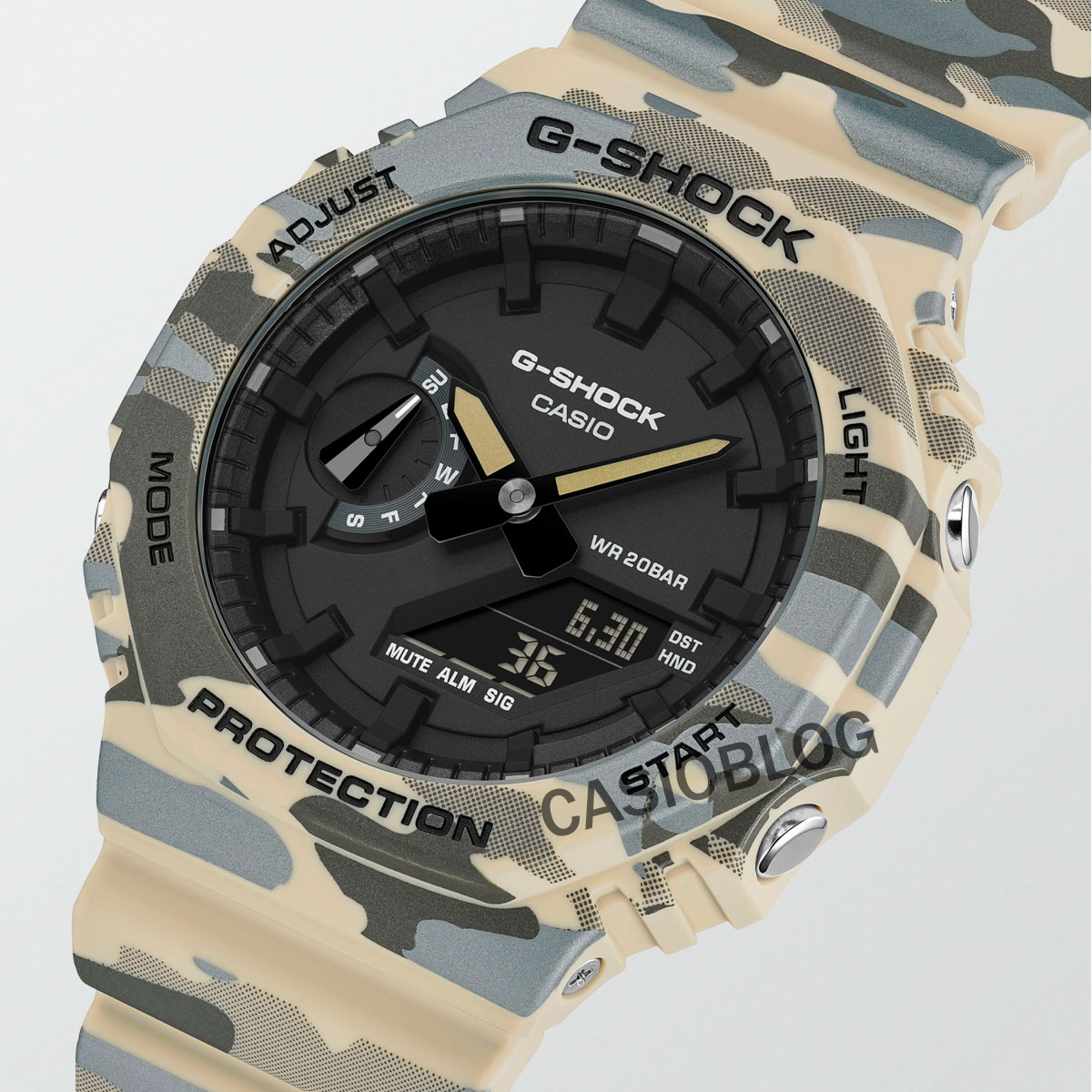 从附图中可以看出,卡西欧在很大程度上倾向于战术美学,两款手表都采用了倒置(负极)显示屏,表带和表圈均为军用迷彩图案。GA-2100CM-8A采用了淡紫色、灰白色的迷彩,而GA-2100CM-5A则选择了沙漠风格的沙色和米色迷彩。据 Casioblog 称,与迷彩条纹同时出现的点状图案是利用激光喷涂技术创造出 3D 效果的。