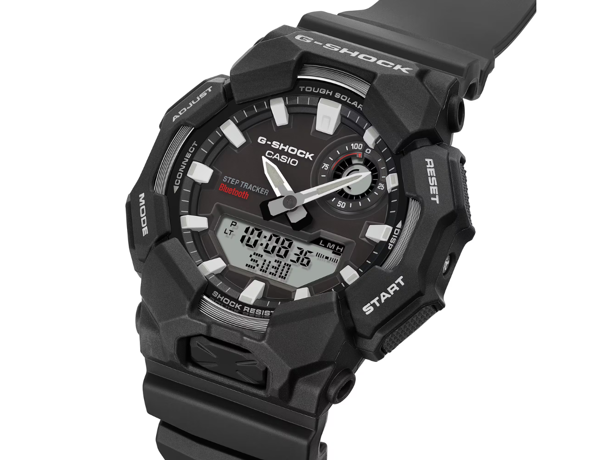 卡西欧的 GA-B010 是一款混合型手表,有两个模拟指针、一个较小的数字显示屏和一个表盘,用于显示实现步数目标的进度。其他与步数相关的功能包括步数提醒和卡西欧手表智能手机应用程序中的数据记录,这要归功于蓝牙连接功能。在应用程序中,您还可以使用自动时间调整和电话查找等工具。这些手表支持世界时间,有 55 个城市可供选择,并具有倒计时器、每小时时间信号、1/100 秒秒表和五个每日闹钟等功能。此外,该表款还提供 Tough Solar 太阳能充电和 200 米防水功能。