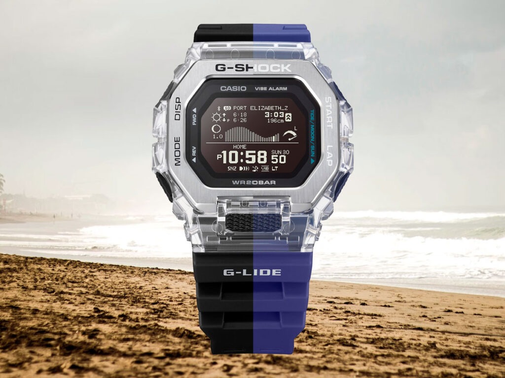 新表款沿用了 GBX-100 的核心设计,但将实心树脂表壳换成了透明镂空表壳,并配以拉丝不锈钢表圈--这种组合在卡西欧以冲浪为重点的产品系列中还从未见过(目前)。我们已经知道了这一点,但我们不知道的是,卡西欧还将推出两种新配色。其中一款采用大胆的黑蓝相间表带,而另一款则坚持全黑设计。两款手表都保持了方形 G-Lide 的轮廓,似乎还保留了我们熟悉的高对比度 MIP LCD,可通过蓝牙同步显示潮汐图、月亮数据和日出/日落时间。