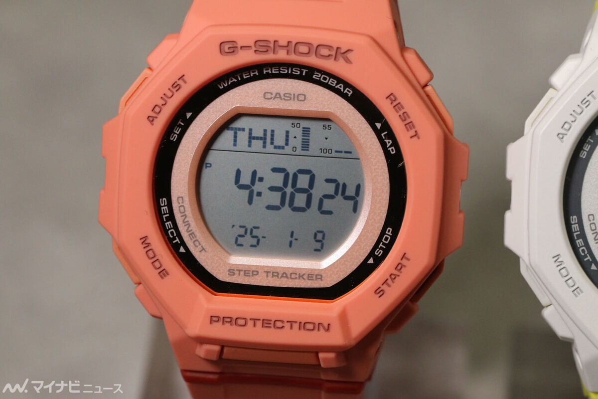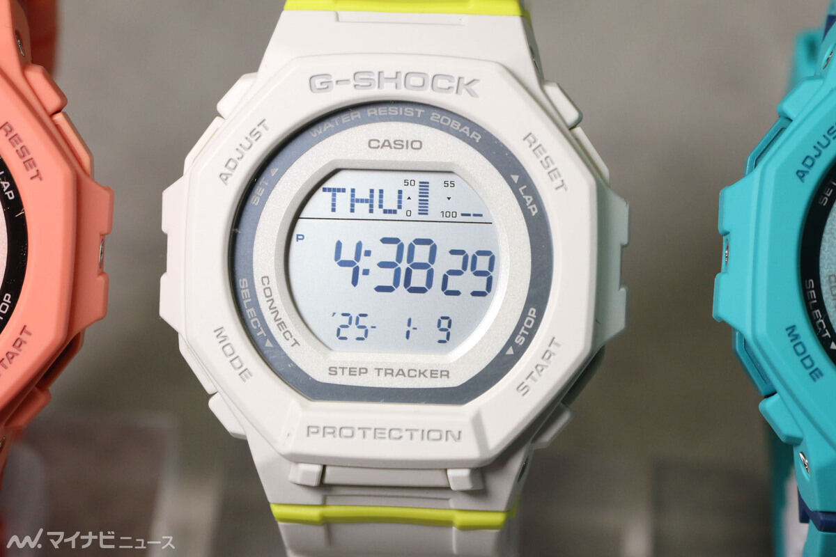 这些新款 GMD-B300SC 手表的照片似乎来自日本网站Mynavi News。.报道称,GMD-B300SC-4 为珊瑚色,配以红色表带装饰;GMD-B300SC-7 为白色,配以黄色条纹;GMD-B300SC-2 为绿松石色,配以蓝色标记。
