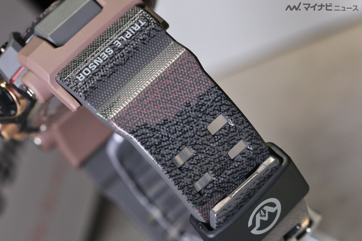 G-Shock GW-9502KJ-8 是与日本地球观测组织(Earthwatch Japan)合作设计的 Love the Sea and the Earth 系列的最新产品。据说这款数字手表的设计灵感来自河马。它有一个圆形的正面(浅色背景)显示屏,周围环绕着一个黑色圆环和一个厚重的表圈。表圈的主要部分采用黑色和红棕色的图案,模仿河马的皮肤。与之相配的是灰色和棕色哑光外壳元素。值得注意的是,从照片上看,按键的颜色更偏向于金色,而不是产品列表中显示的青铜色或玫瑰金色。