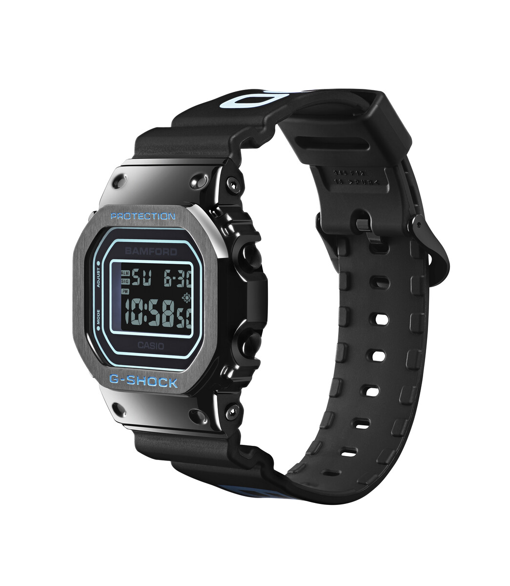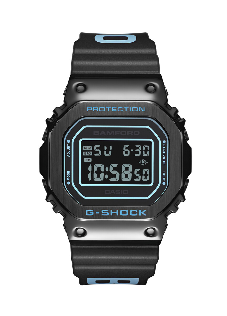 这款全新的 G-Shock x Bamford 5600 手表沿用了相同的设计,但增加了一些独特的更新。附图显示的是黑色抛光钢框表壳,表圈、表盘边框和文字均采用 Bamford 的蓝色装饰。哑光表带上印有同样色调的 "Bamford "字样,既保持了合作的视觉一致性,又不失装饰性。显示屏采用负向液晶显示屏,搭配蓝灰色数字,看起来比标准的 5600 型号更加简洁。整体给人的印象是方形表款更加锐利、精致。