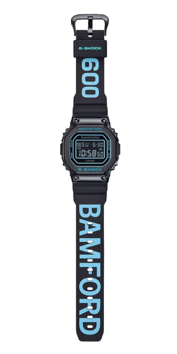 GM-5600BWD-1 是 G-Shock 与英国品牌 Bamford Watch Department 的第三款合作手表。它采用黑色和亮蓝色设计,尺寸为 49.6 x 43.2 x 12.9 毫米(~1.95 x 1.70 x 0.51 英寸)。黑色元素包括离子镀钢表圈、树脂外壳和表带以及深色背景显示屏。屏幕周围有蓝色线条点缀,表带上写有 "5600 "和 "Bamford "字样。