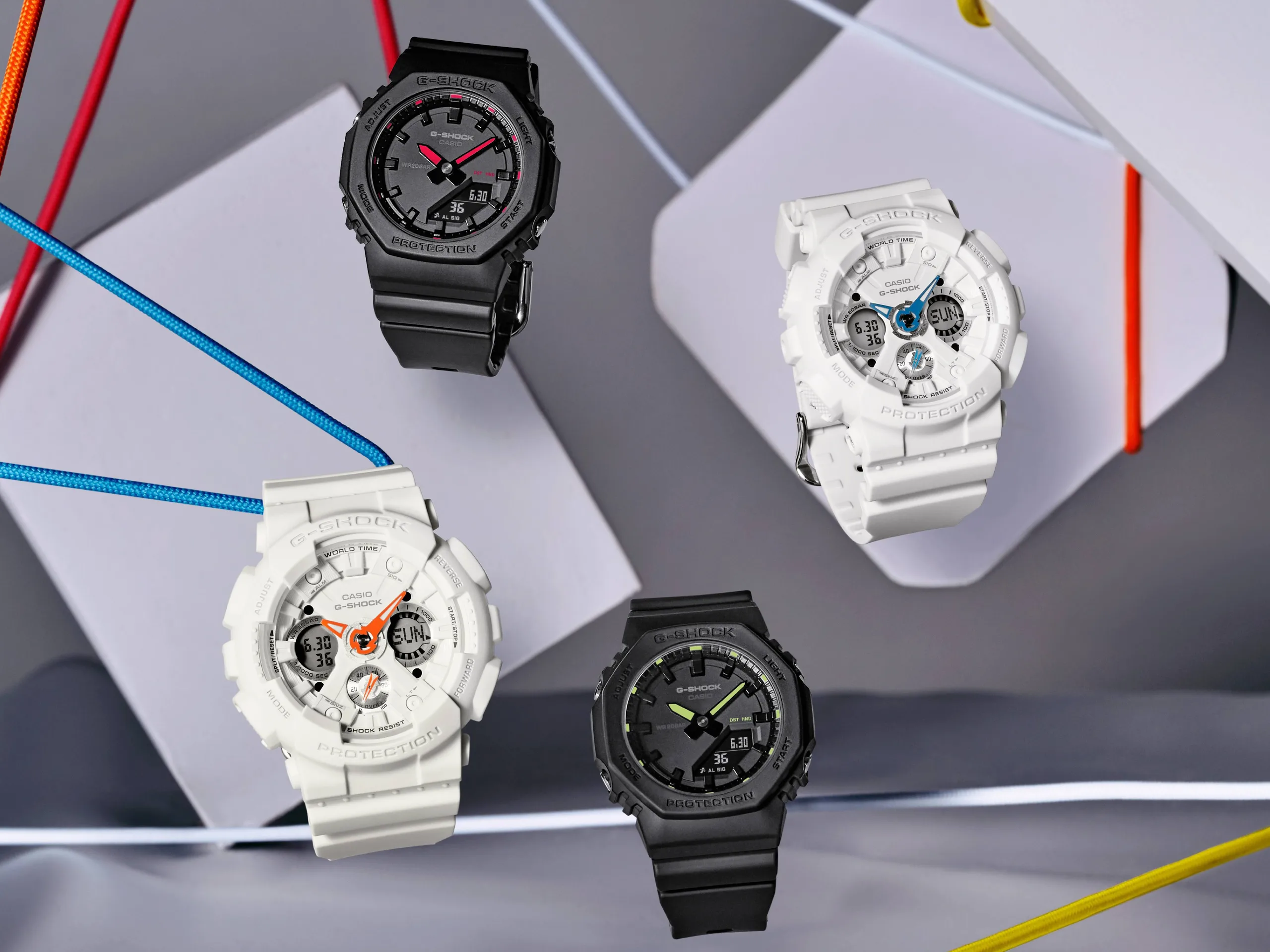 GMA-S120SA 也是混合型手表,不过它们具有两个较小的数字显示屏和一个指示表盘。该表款支持 29 个世界时区,具有主城功能和防磁功能。该表款的功能包括 1/1000 秒秒表、倒计时器、5 个闹钟和琥珀色 LED 背光。两款手表均为纯白色,圆形表圈非常厚重。唯一的非白色元素是指针和表盘指示器,GMA-S120SA-7A1 为橙色,GMA-S120SA-7A2 为蓝色。