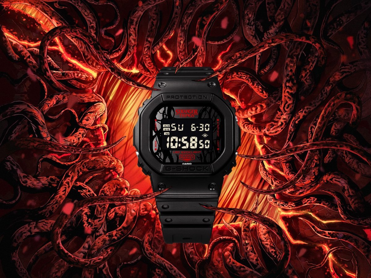 G-Shock DW-5600STT-1JR 装在一个特别的主题包装盒中,包装盒上印有葡萄藤图案和 Demogorgon(《怪奇物语》系列中最著名的怪物之一)的图像。