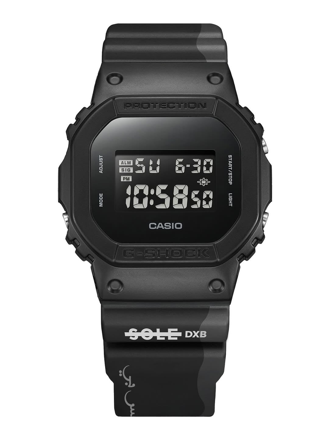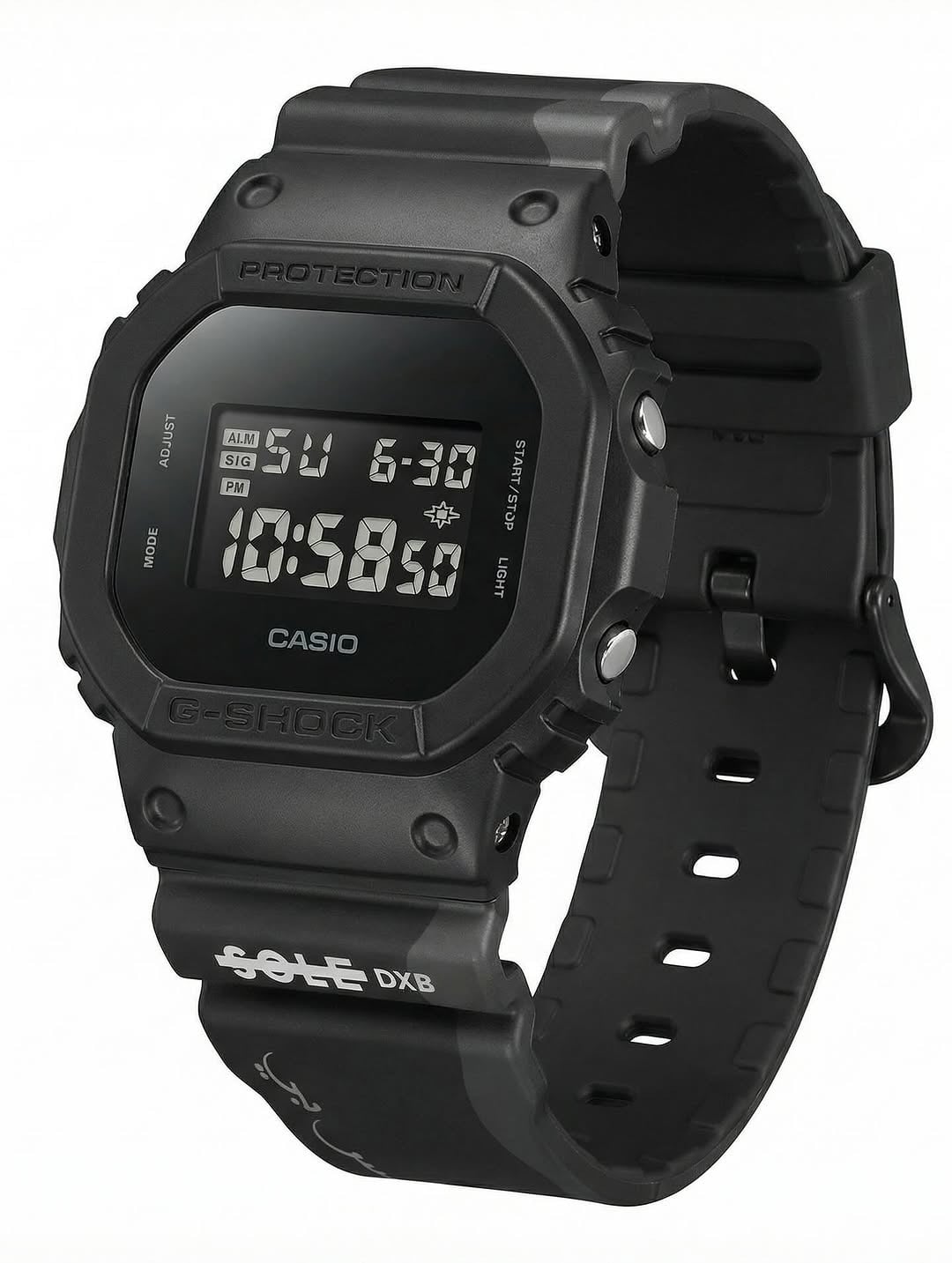此次合作采用了 G-Shock 的方形数字表壳。从产品图片来看,这款手表采用哑光黑色树脂表壳和表带,搭配深色低对比度数字显示屏。表圈上印有标准的 "Protection"(保护)和 "G-Shock"(G-Shock)标志,表带上则印有 "Sole DXB"(Sole DXB)文字,表带下部印有风格化的阿拉伯文字。
